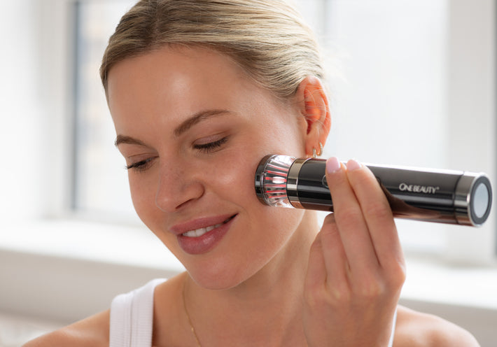 Combines RF, EMS, and light therapy for comprehensive skincare treatment.